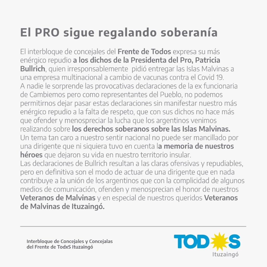 Ituzaingó: concejales del Frente de Todos repudió los dichos de Bullrich sobre Malvinas En un comunicado, los ediles oficialistas reafirmaron también la soberanía sobre las islas, luego de que la presidenta del Pro afirmara que había que “entregarlas” a cambio de vacunas contra el coronavirus.